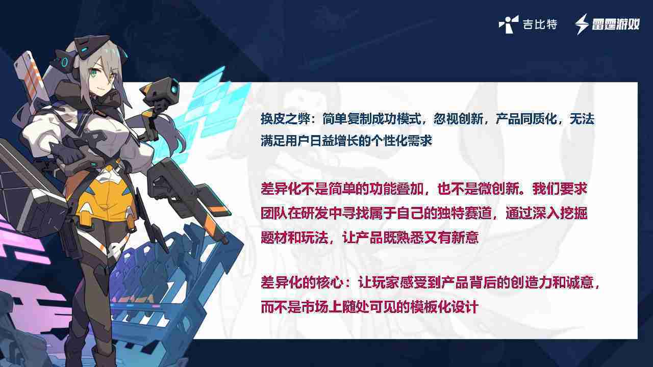 在我们内部是这么定义差异化的。。。。首先,,,,差异化不是简单的功能叠加,,,,更不是换皮。。只是换皮,,产品无法提供有效的市场价值。。内部经常说差异化的产品不是为了迎合市场,,而是找到一个自己独特的表达方式,,,在研发中找到属于自己的细分赛道和独特赛道,,,前提是需要对这个题材有足够的深入、、、、挖掘,,,,对玩法有足够深入的理解,,让产品看起来既熟悉又有新意。。。