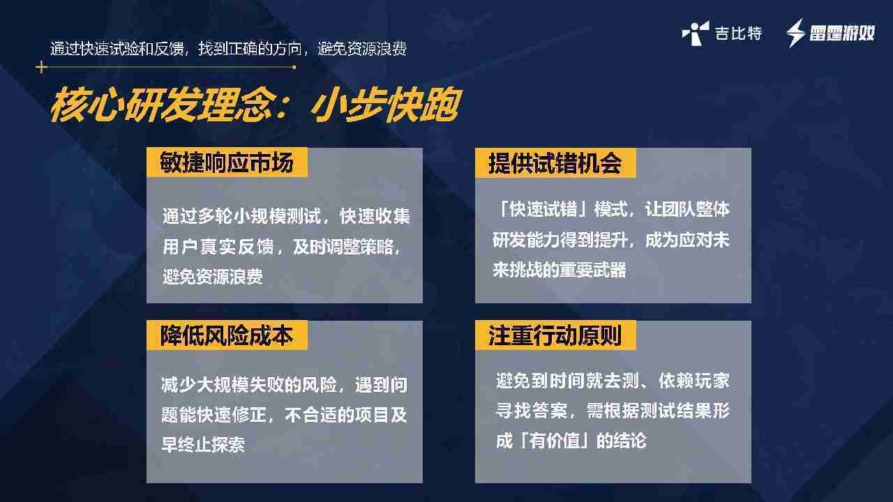 小步快跑不是找答案,,,而是验证答案。。。我们之前有项目是这样的,,有些制作人会有几个方向觉得都可以做,,,,但是不确定做哪一个,,会选择几个都做,,,做完拿到市场跑,,跑出哪一个更好,,基于这个再做后续的研发和拓展。。。。但这种情况最容易出现一个问题,,可能被玩家裹胁,,,,玩家说这个点不错、、那个点不错,,,到底听还是不听,,不听感觉是无视玩家的反馈,,,,听的话,,可能自己没想清楚导致研发思路发生偏颇。。。所以针对这一点后面自己复盘整理,,发现制作人自己心里要有数,,,,要做自己觉得好玩的,,而且明确知道这个东西是你想做的,,,,然后拿到市场验证这个答案是不是对的,,,而不是拿一堆答案找哪一个答案更好。。