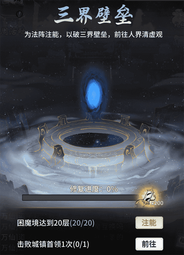 当你修为达到返虚/破虚中期后,,,,可在城镇寻得芸丫并激活神秘法阵,,,通过收集材料、、、、击败首领等方式为法阵注能,,借以打破三界壁垒,,,,开启支线剧情“清虚旧梦”